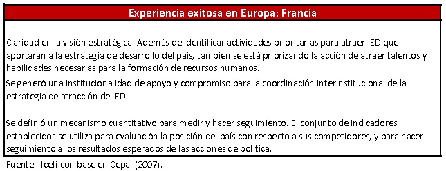 El segundo elemento para atraer el tipo de IED con la calidad para aportar a un plan de desarrollo, es el conocimiento de los factores que estas inversiones toman en cuenta para instalarse en determinada nación, entre los que se encuentran el acceso a consumidores (países con poca pobreza e indigencia), ambiente político y social estable, facilidad para hacer negocios, calidad y confiabilidad de la infraestructura y los servicios básicos (educación, salud, seguridad, justicia), y la facilidad para contratar profesionales técnicos y ejecutivos. Francia es el mejor ejemplo de este elemento. Contrario al mito generalizado en muchos discursos, acerca de que el cobro de impuestos desincentiva la atracción de IED, el pago de impuestos ocupa el puesto 11 en el ranking de los 20 factores críticos que las empresas transnacionales consideran para seleccionar un país. Por el contrario, solo los Estados con suficientes recursos ?humanos, materiales, financieros y de probidad?, tienen la capacidad de satisfacer los factores solicitados por los inversionistas extranjeros.