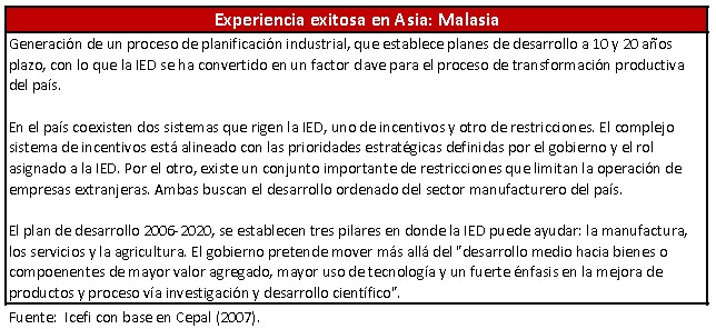 En primer lugar, las naciones no están al servicio de la IED, sino viceversa. Esto implica que los Estados deben contar con políticas activas para la atracción de inversiones, que se insertan en un plan de desarrollo. Es decir, los Estados deben saber hacia dónde llegarán en el futuro y reconocer que no todas las inversiones son iguales para lograr sus objetivos. En países como Irlanda, Singapur y Malasia, la IED ha contribuido significativamente en la transformación productiva, apuntalando sectores económicos que generan mayor valor, empleo y competitividad en las exportaciones. Por el contrario, en países en donde las políticas de atracción de IED están divorciadas de planes de desarrollo o son pasivas frente a la IED, es decir, se basan en la estabilidad macroeconómica y en la existencia de privilegios fiscales, las inversiones llegarán atraídas únicamente por la búsqueda de mercados y la explotación de recursos naturales, lo que puede provocar distorsiones económicas y mayor ingobernabilidad social.