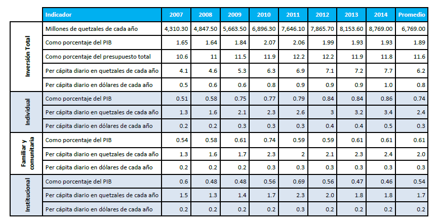 Entre 2007 y 2014, la inversión individual se estimó, en promedio, en 0.7% del PIB, es decir Q2.5 diarios per cápita (USD0.3 al día); la inversión familiar y comunitaria se estimó, en promedio, en 0.6% del PIB (Q2.0 o USD0.3 diarios per cápita); en tanto que la inversión institucional se estimó, en promedio, en 0.5% del PIB (Q1.7 o USD0.2 diarios per cápita).