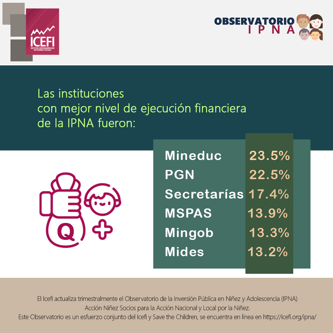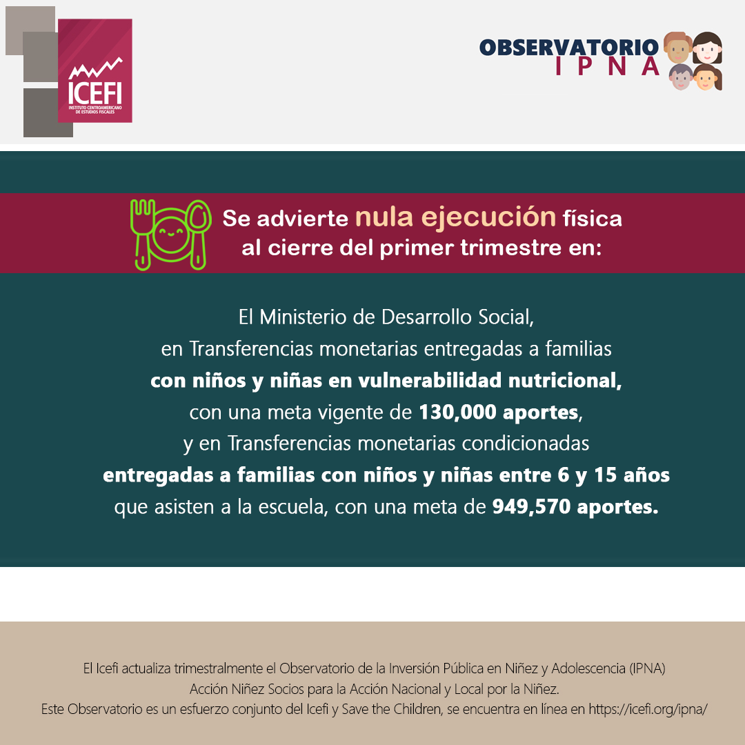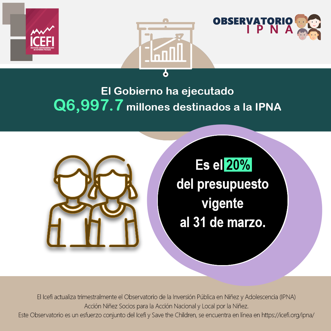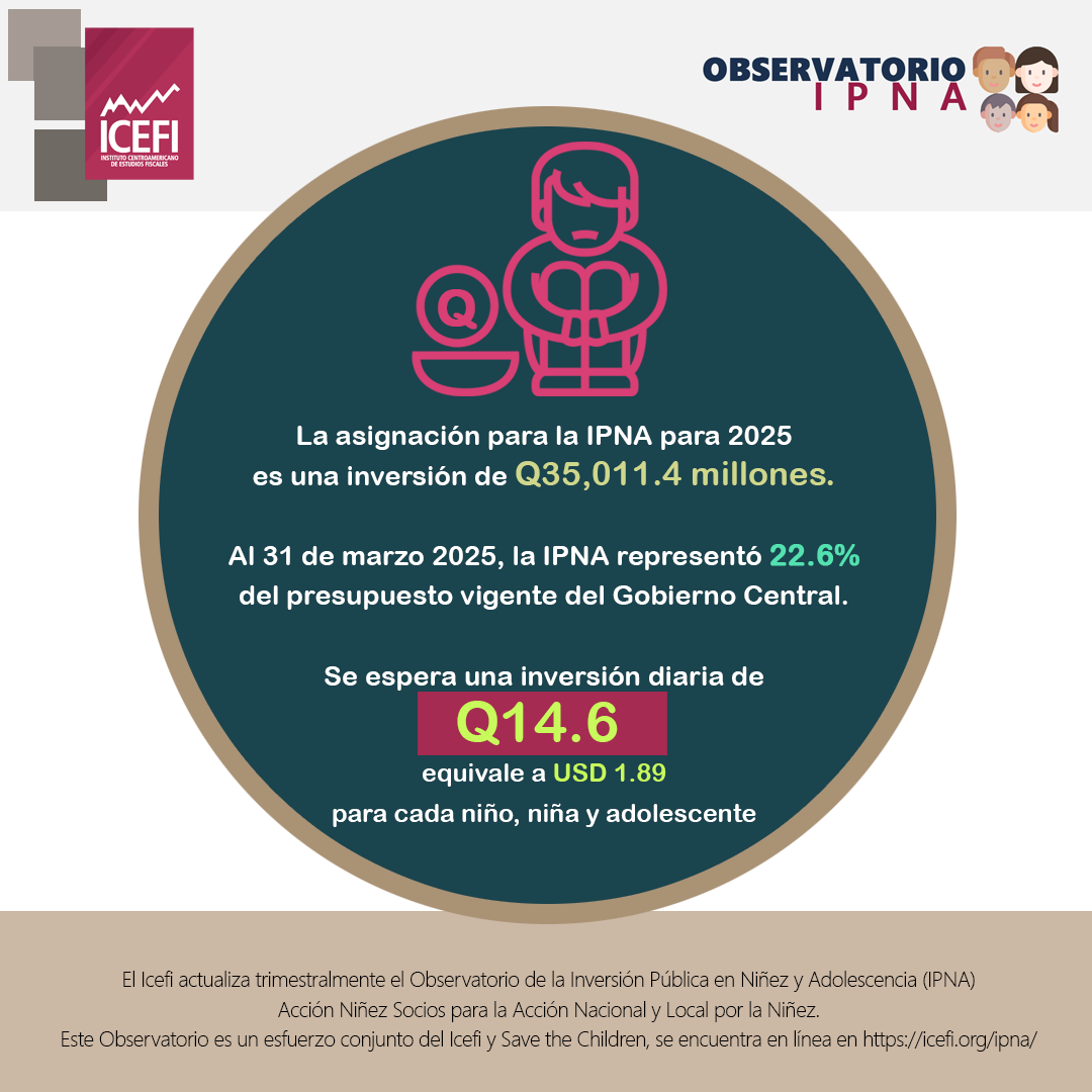 El Instituto Centroamericano de Estudios Fiscales (Icefi) presneta la actualización trimestral del Observatorio de la Inversión Pública en Niñez y Adolescencia (IPNA), Acción Niñez, Socios para la Acción Nacional y Local por la Niñez. Este Observatorio es un esfuerzo conjunto del Icefi y Save the Children, y puede consultarse de manera libre y gratuita en línea en https://icefi.org/ipna/.