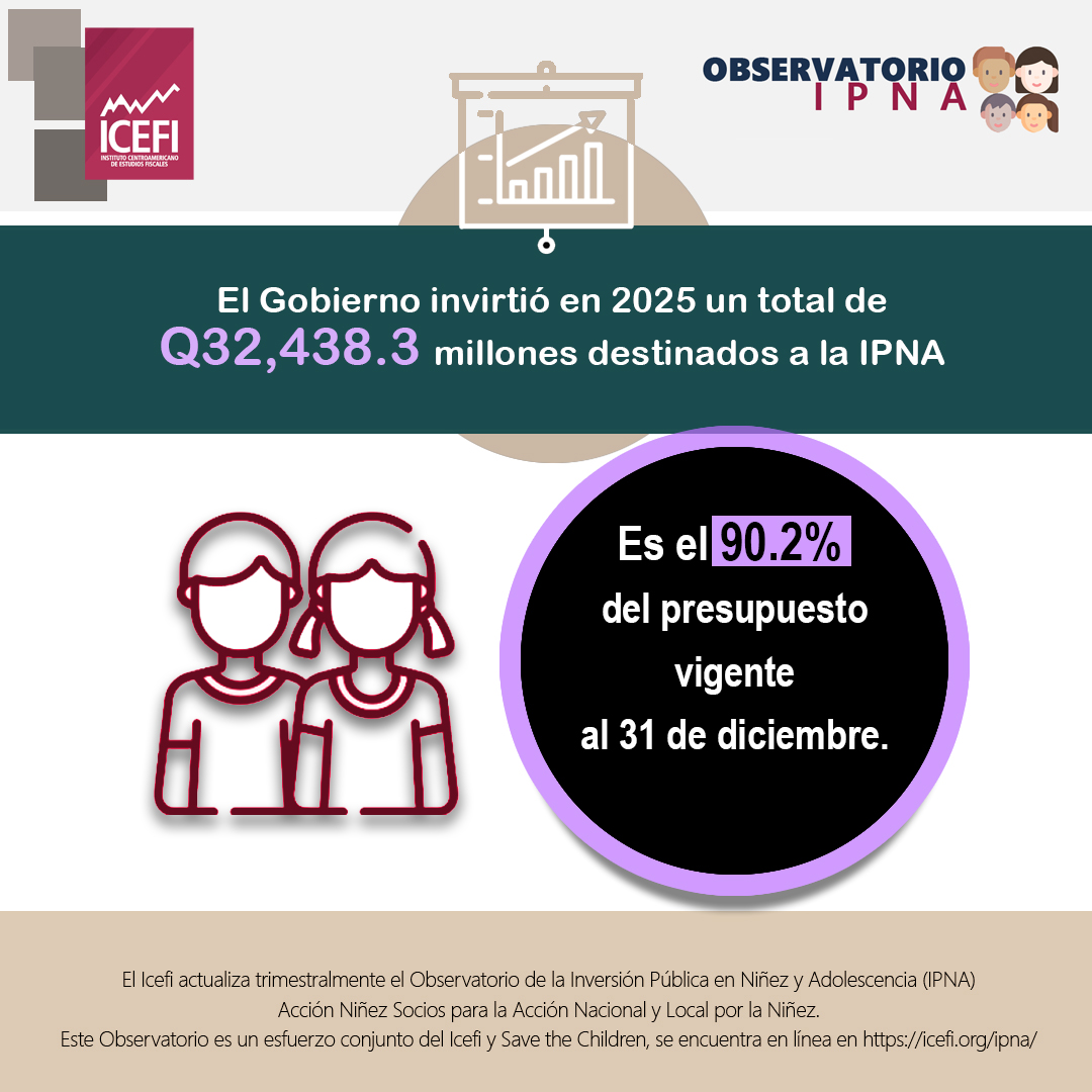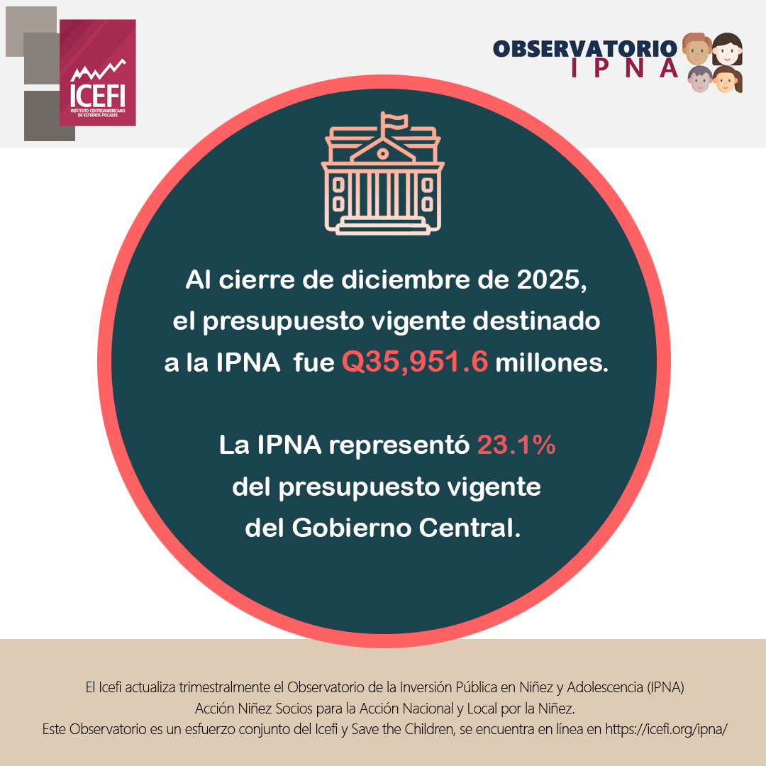 El Instituto Centroamericano de Estudios Fiscales (Icefi) presenta la actualización trimestral del Observatorio de la Inversión Pública en Niñez y Adolescencia (IPNA), Acción Niñez, Socios para la Acción Nacional y Local por la Niñez. Este Observatorio es un esfuerzo conjunto del Icefi y Save the Children, y puede consultarse de manera libre y gratuita en línea en https://icefi.org/ipna/.