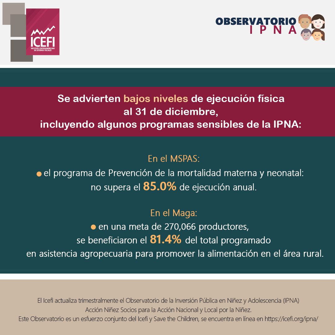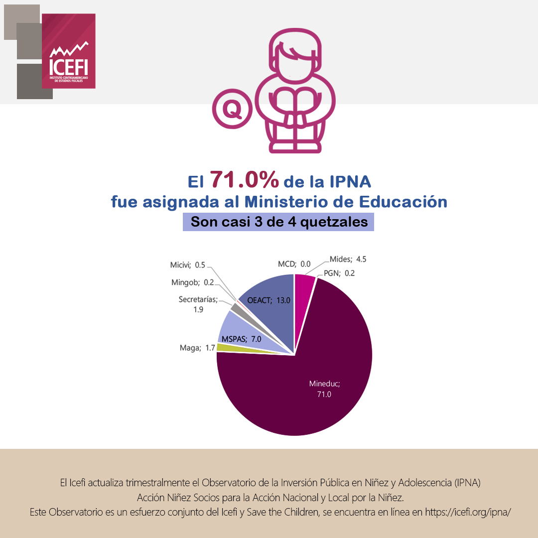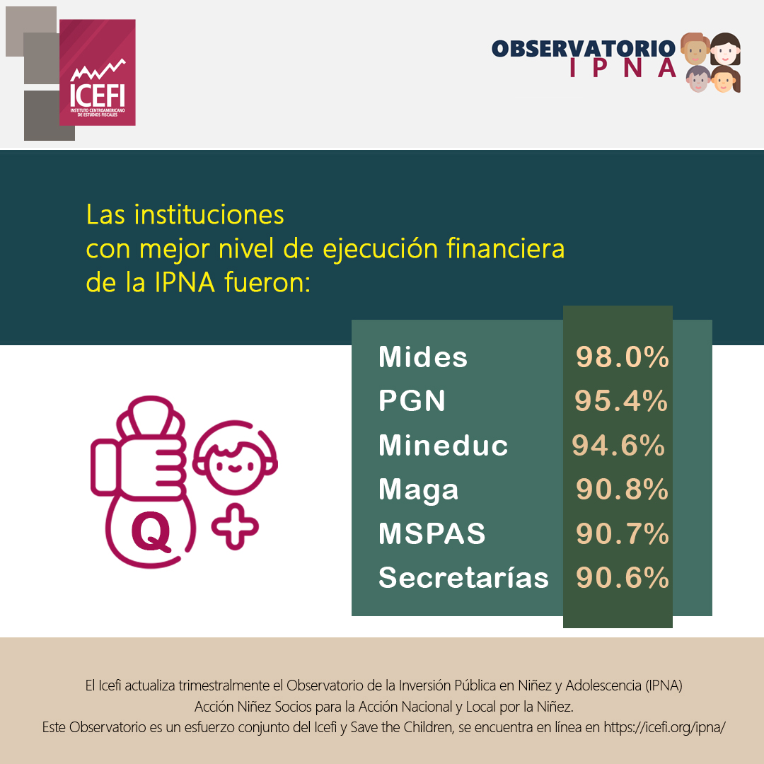El Instituto Centroamericano de Estudios Fiscales (Icefi) presenta la actualización trimestral del Observatorio de la Inversión Pública en Niñez y Adolescencia (IPNA), Acción Niñez, Socios para la Acción Nacional y Local por la Niñez. Este Observatorio es un esfuerzo conjunto del Icefi y Save the Children, y puede consultarse de manera libre y gratuita en línea en https://icefi.org/ipna/.
